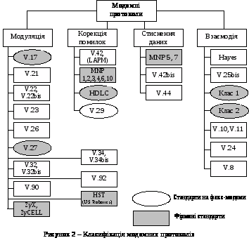 3) протоколи модуляції, що визначають основні характеристики модемів, призначених для комутованих і виділених телефонних каналів (V.17, V.22, V.32, V.34, V.90, HST, ZyX та ін.);
