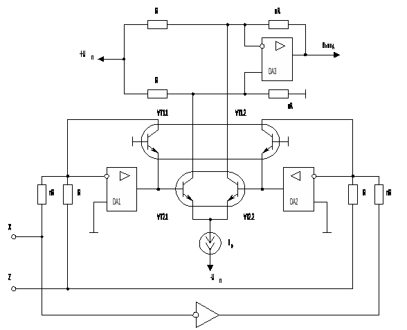 Выходное напряжение U>1> микросхемы DA1 равно U>Э> транзистора VT1.1. Ток этого транзистора равен сумме входных токов, вызываемых сигналами X = X+ – X–> >и Z = X+ + X–> >: