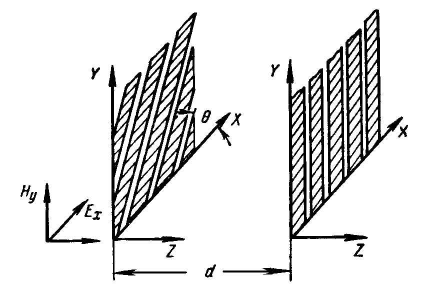 Измерение мощности многих видов колебаний в субмиллиметровом диапазоне с помощью проволочных решеток, установленных в волноводе, затруднительно из-за малого периода решетки и необходимости иметь две решетки, чтобы болометр реагировал на перпендикулярную и параллельную поляризации электромагнитного поля. Наиболее удобными являются пленочные металлические болометры, расположенные для лучшего согласования под углом к оси волновода (рис. 5.8).