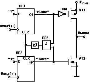 На рис.1 показана структура простейшего цифрового ЧФД, построенного на двух D-триггерах. Состояния их выходов определяют работу транзисторных ключей VT1, VT2 следующим образом.