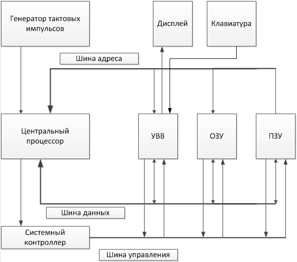 Общий принцип функционирования микропроцессорного устройства заключается в следующем. Из микропроцессора на шину адреса выдается адрес очередной команды. Считанная по этому адресу из памяти (например, из ПЗУ) команда поступает на шину данных и принимается в микропроцессор, где она и исполняется. В счетчике команд микропроцессора формируется адрес следующей команды. После окончания исполнения данной команды на шину адреса поступает адрес следующей команды и т. д.