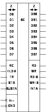 Центральный процессорный элемент КР580ВМ80А является функционально законченным однокристальным параллельным 8-разрядным микропроцессором с фиксированной системой команд. В состав БИС входят: 8-разрядное арифметико-логическое устройство (ALU); регистр признаков (RS), фиксирующий признаки, вырабатываемые ALU в процессе выполнения команд; аккумулятор (А); блок регистров для приема, выдачи и хранения информации в процессе выполнения программ, содержащий программный счетчик (РС), указатель стека (SP), регистр адреса (RGA), шесть регистров общего назначения (B, C, D, E, H, L) и вспомогательные регистры (W и Z); схема управления и синхронизации (CU), формирующая последовательности управляющих сигналов для работы ALU и блока регистров; 16-разрядный буферный регистр адреса (ВА); 8-разрядный буферный регистр данных (BD).