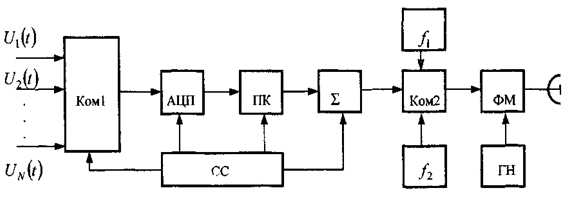 В простейшем случае работу передатчика можно объяснить следующим образом. На вход коммутатора Ком1 поступают N передаваемых сообщений U1(t), U2(t). С помощью АЦП они преобразуются в цифровой код. Преобразователь кода ПК служит для преобразования кода в последовательный. Схема синхронизации (СС) управляет работой передающей части и вырабатывает следующие сигналы: