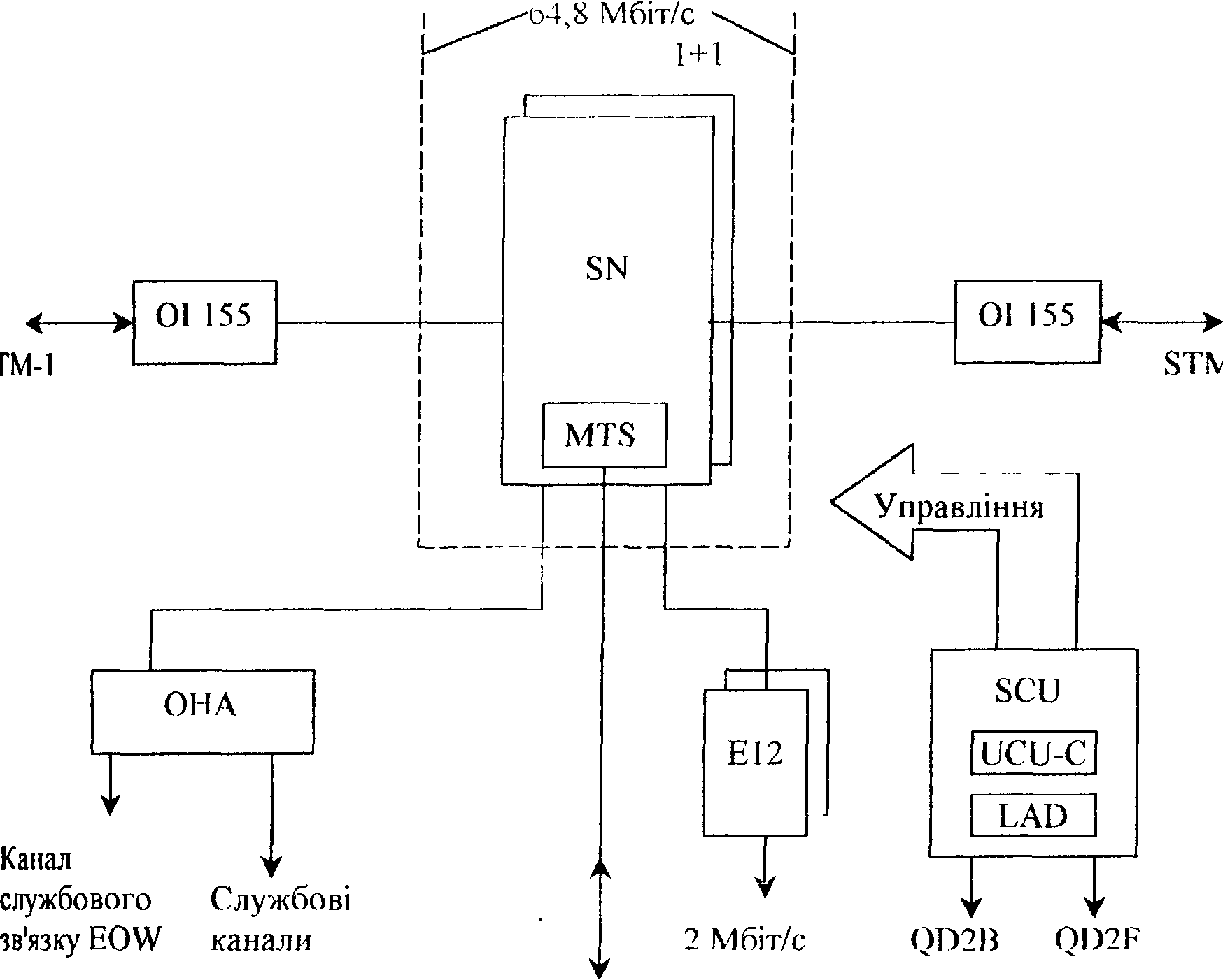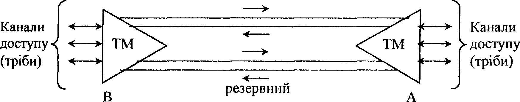 а) «точка-точка» - є найбільш простим прикладом базової топології SDH (малюнок 1.1). Вона може бути реалізована за допомогою термінальних мультиплексорів ТМ, як на схемі без резервного каналу прийому/передачі, так і за схемою з стовідсотковим резервуванням типу 1+1, що використовує основний і резервний електричний чи оптичний агрегатні виходи (канали прийому/передачі). При виході з ладу основного каналу мережа в лічені десятки мілісекунд автоматично переходить на резервний;