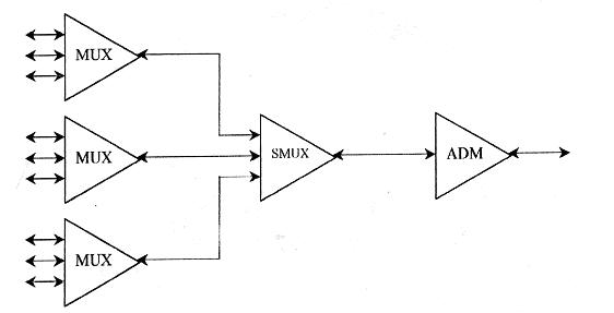 в) топологія «зірка» (малюнок 1.3), що реалізує функцію концентратора. У цій топології один з віддалених вузлів мережі, зв'язаний з центром комутації чи вузлом мережі SDН на центральному кільці, відіграє роль концентратора, де частина трафіку може бути виведена на термінали користувачів, що тоді як залишкова його частина може бути розподілена по іншим віддаленим вузлам. Іноді таку схему називають оптичним концентратором, якщо на його входи "Подаються частково заповнені потоки рівня STМ-N (чи потоки рівня на ступінь нижче), а на його вихід надходить STМ-N. Фактично ця топологія нагадує топологію «зірка», де як цей гральний вузол використовується мультиплексор SDH.