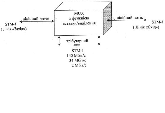 б) топологія «послідовний лінійний ланцюг» (малюнок 1.2). Ця базова топологія використовується, коли інтенсивність трафіку в мережі не так велика й існує необхідність відгалужень у ряді точок на лінії, де можуть вводитися і виводитися канали доступу. Вона реалізується з використанням як термінальних мультиплексорів на обох кінцях, так і мультиплексорів вводу/виводу в точках відгалуження. Ця топологія нагадує послідовний лінійний ланцюг, де кожен мультиплексор вводу/виводу є окремою її лапкою. Вона може бути представлена вигляді послідовного лінійного ланцюга без резервування, або більш складним ланцюгом з резервуванням типу 1+1;