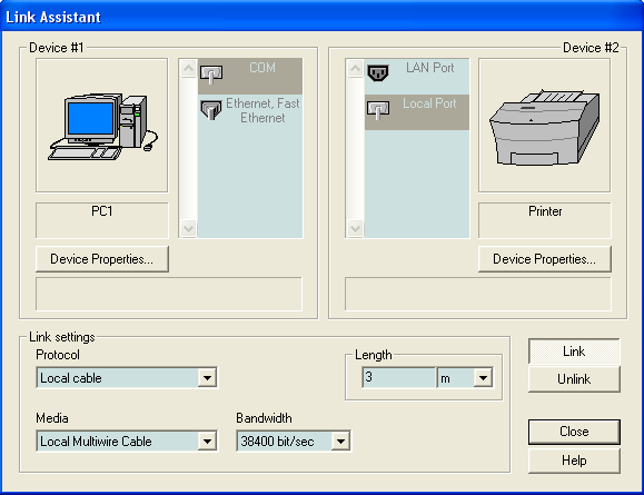 На схемі показано підключення принтеру до робочої станції РС1 через порти COM та LocalPort