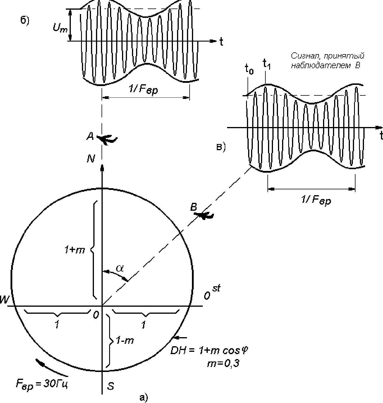 Пусть в момент t=0 напряжённость поля излучения антенны в направлении 0W и 00stравна 1, в направлении 0N равна 1+m, а в направлении 0S равна 1-m.Предположим, что маяк излучает немодулированную несущую f>0>. Тогда сигнал, принятый наблюдателем А, можно записать в виде