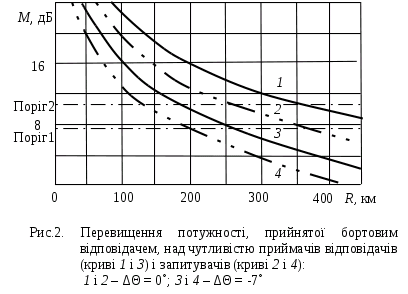 Як приклад на рис. 2 наведені результати розрахунку перевищення потужності, прийнятої бортовим відповідачем (криві 1 і 3), і потужності, прийнятої запитувачем (криві 2 і 4), над рівнем потужності, відповідній чутливості приймача відповідача і чутливості приймача запитувача. Криві 1 і 2 належать випадку, коли коефіцієнт підсилення антени запитувача дорівнює максимальному значенню 27 дБ [L∆ G() = 0 дБ], а криві 3 і 4 – коли кут відрізняється від кута місця максимуму ДН антени у прямовисній площині, на -7. Змінення коефіцієнта підсилення антени запитувача тут дорівнюватиме -6 дБ [L∆ G(-7о)= –6 дБ].