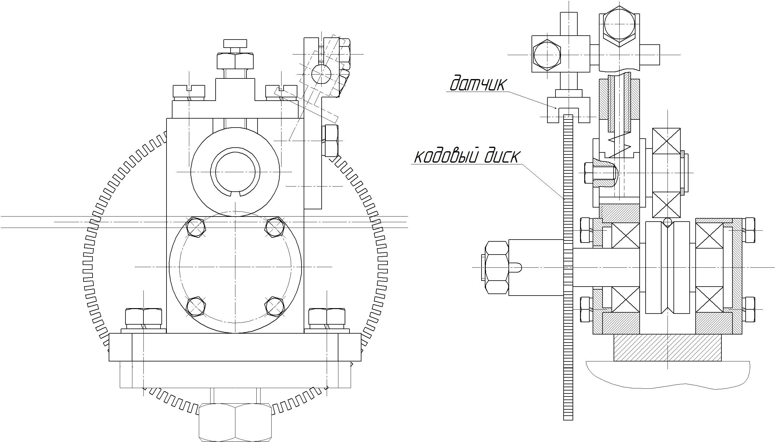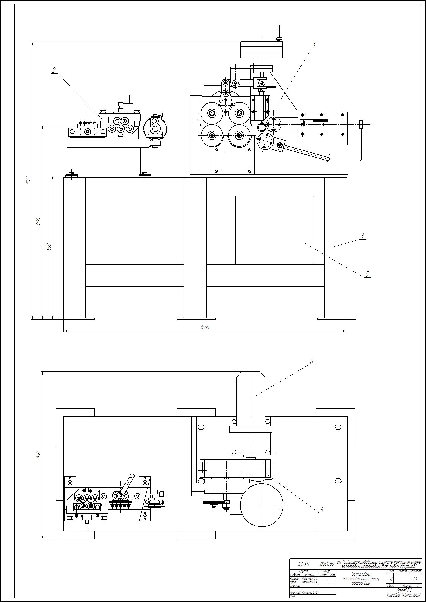 1 – механизм подачи и гибки, предназначенный для гибки прутка в кольцо определенного диаметра и отрезки кольца. Механизм подачи состоит из двух пар тянущих профильных роликов. Приводится в действие механизм подачи системой зубчатых колес от мотор-редуктора. При резке кольца рычажный механизм разводит ролики и подача прекращается. Отрезка производится ножом, перемещающимся по направляющим и приводящимся в действие от пневмоцилиндра. Механизм гибки настраивается на гибку колец различного диаметра от 50 до 480 мм из прутка диаметром 5 мм.