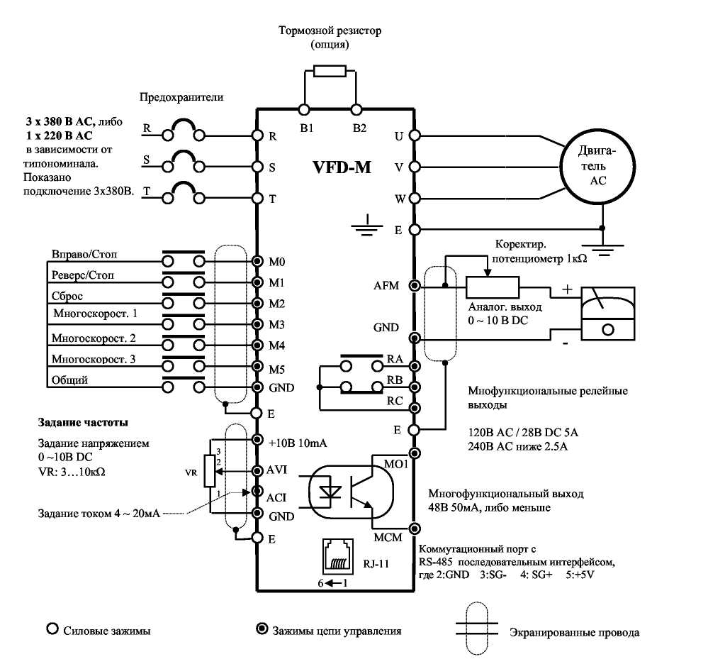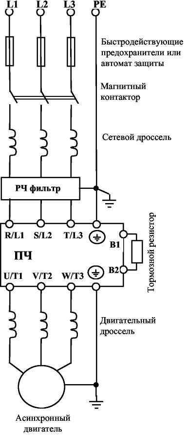 сопротивление контура заземления не должно превышать 100 Ом. Заземление между ПЧ, двигателем и экранирующей оболочкой кабеля должно иметь высокочастотную эквипотенциальность;