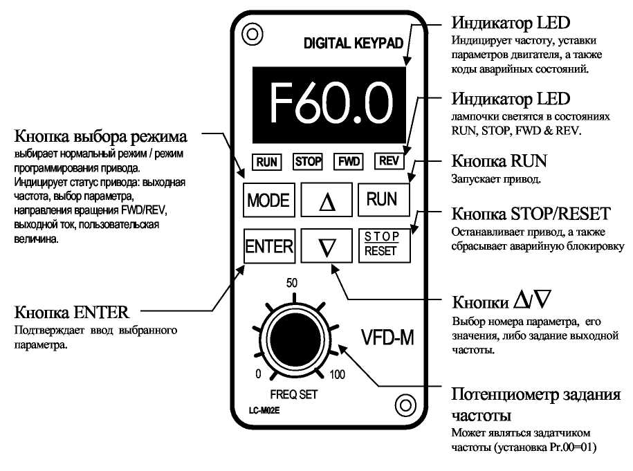 С преобразователем производителем поставляется цифровая панель управления LC-M02E, монтируется на лицевой стороне преобразователя. Внешний вид панели представлен на рисунке 22. Панель состоит из двух частей: индикатора и клавиатуры. Индикатор позволяет визуально контролировать текущий статус и параметры привода. Клавиатура позволяет управлять работой привода, просматривать и программировать уставки параметров.