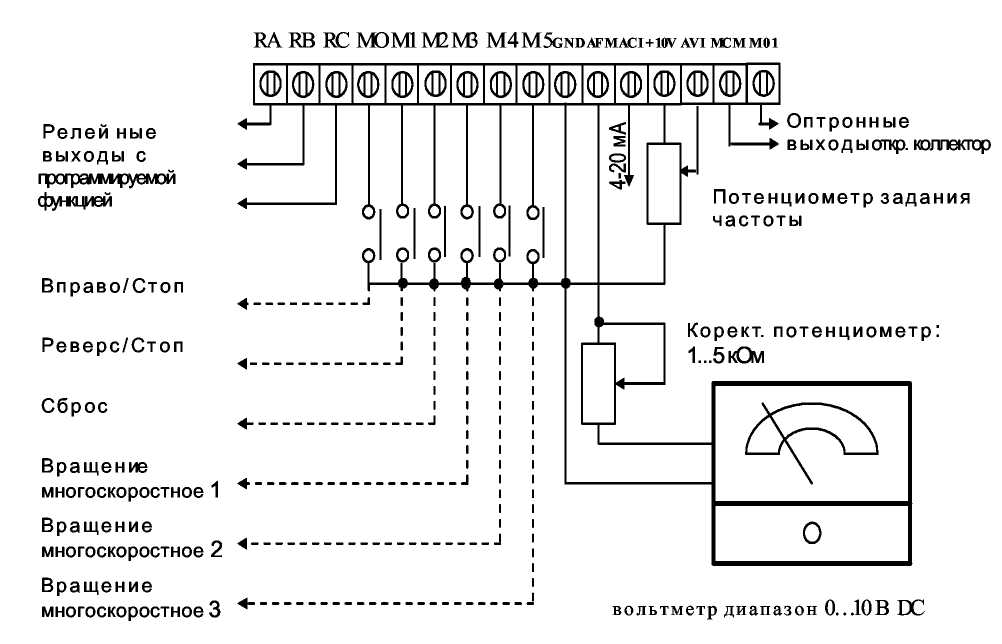 Название терминала RA-RC Многофункциональный выход (релейный НО) RB-RC Многофункциональный выход (релейный НЗ) M0-GND Многофункциональный вход дополнительный M1-GND Многофункциональный вход 1 M2-GND Многофункциональный вход 2 M3-GND Многофункциональный вход 3 M4-GND Многофункциональный вход 4 M5-GND Многофункциональный вход 5 МО1 -МСМ Многофункциональный выход 1 (открытый коллектор) +10В - GND Питание задатчика скорости. Ток нагрузки до 20мА. AVI - GND Аналоговый вход задатчика скорости (задание по напряжению) ACI - GND Аналоговый вход задатчика скорости (задание по току) AFN-GND Аналоговый выход