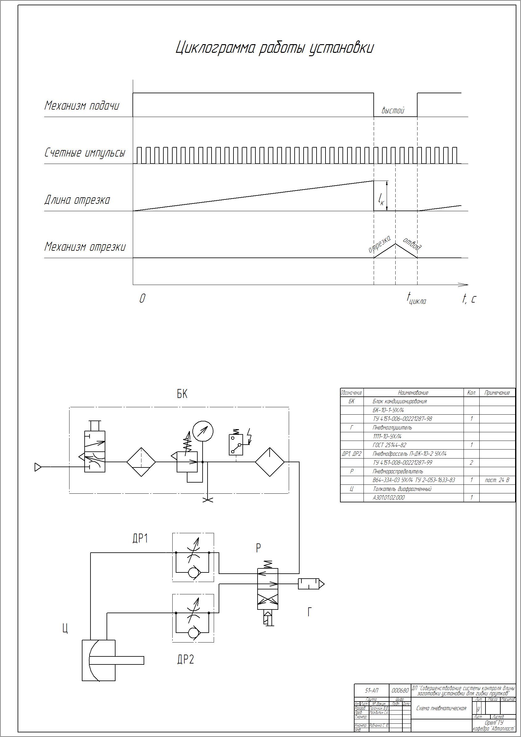После записи установленных значений и прихода счетных импульсов с блока формирования значение выходных разрядов счетчиков начнет уменьшаться и, когда достигнет значения равного нулю, на выходе 7 микросхемы DD4 появится сигнал логического "0". Этот сигнал, пройдя инвертор DD5.2, сбросит в нулевое состояние триггер DD7.1, транзистор VT1 закроется, и пневмораспределитель переключит перемещение пневмоцилиндра в противоположное направление, произойдет резка кольца. После резки будет сформирован сигнал от бесконтактного выключателя, который запишет новое значение длины окружности в счетчики и взведет триггер. На его выходе появится сигнал логической "1". Транзистор VT1 откроется, пневмоцилиндр смени направление перемещения. Во время резки кольца, когда подвижный нож находится в нижнем положении, приводные ролики разожмутся, и заготовка останется на месте. Это обеспечивает точность реза, независящая от скорости перемещения пневмоцилиндра. В таком режиме установка может работать до израсходования заготовки.