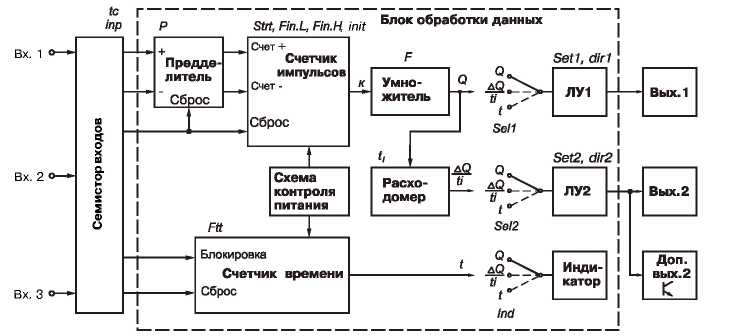 Блок обработки данных содержит реверсивный счетчик импульсов с предделителем на входе и умножителем на выходе, счетчик времени и вычислитель среднего расхода, а также два логических устройства, которые в соответствии с заданным пользователем алгоритмом формируют сигналы управления выходными устройствами.