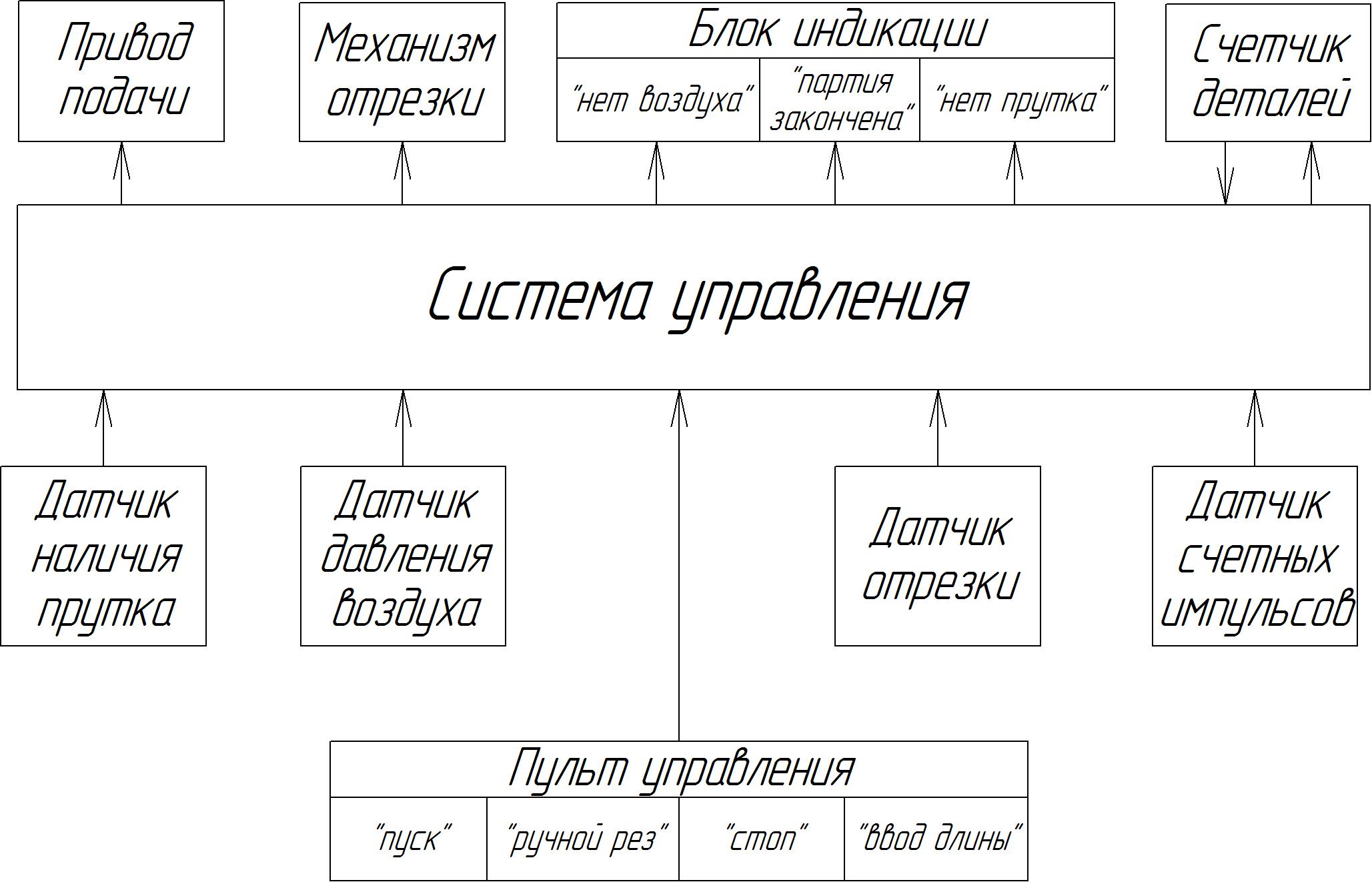 После начала работы необходимо включить подачу воздуха, после этого производится проверка давления воздуха в системе. Если оно падает ниже определенного предела, установка отключается и производится сигнализация "нет воздуха". Если давление в норме, производится ввод длины отрезка и количества деталей в партии. Далее обнуляется счетчик деталей. Производится ручной рез, после чего начинается цикл работы. Производится запись длины отрезка в память блока управления. Далее производится подача прутка. При перемещении прутка на 1 мм выдается счетный импульс, который уменьшает длину отрезка в памяти на 1 мм. После этого производится проверка равенства нулю длины отрезка. При невыполнении условия осуществляется возврат к подаче прутка. При выполнении условия производится отрезка кольца, и количество деталей увеличивается на одну. Далее проверяется условие равенства числа деталей числу, записанному в память счетчика деталей. При равенстве отключается подача прутка и выдается сигнализация "конец партии". Если же равенство не выполняется, проверяется наличие заготовки. Если пруток закончился, подача также отключается и включается сигнализация "нет прутка". Если заготовка есть, то начинается новый цикл работы.