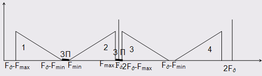 Крім того, доцільно забезпечити рівність захисних проміжків (ЗП) по ширині між спектром сигналу (2) і бічних смуг (1 і 3), тобто: