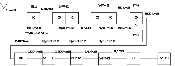 17) Нарисовать полученную структурную схему, написать типы транзисторов (ИМС) в каскадах (трактах), частоты, величины входных сигналов каскадов и коэффициент усиления в них.
