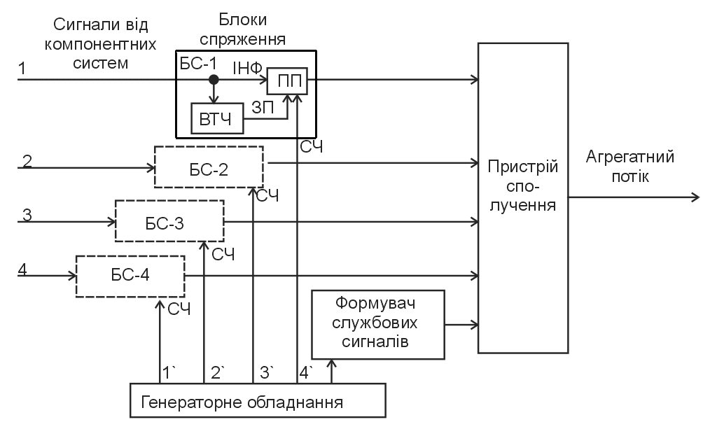 Формування агрегатного потоку здійснюється шляхом об'єднання вихідних сигналів блоків асинхронного спряження і службових сигналів.