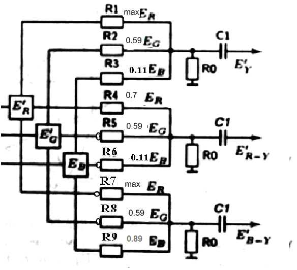 Матрица на девяти сопротивлениях для формирования Ey и E>R>>->>Y>; E>B>>->>Y>> >сигналов, расчет коэффициентов матрицирования.