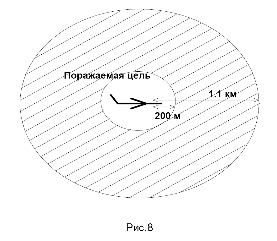 Зададимся мощностью передатчика P>пап >= 150 Вт. По приведенным в пункте 3 графикам можно нарисовать примерную зону прикрытия самолета-цели активной помехой радиовзрывателю (Рис.8).