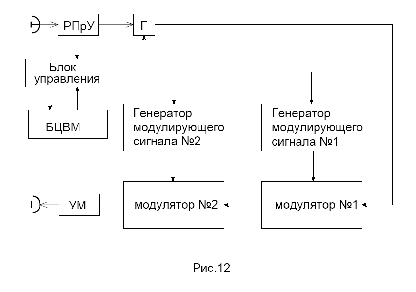 Упрощённая структурная схема устройства постановки помех радиовзрывателю изображена на рис.12. В разведывательном радиоприёмном устройстве (РПрУ) производиться измерение параметров подавляемой РЛ ГСН. Генератор (Г), генерирует колебания несущей частотой равной несущей РЛ ГСН.
