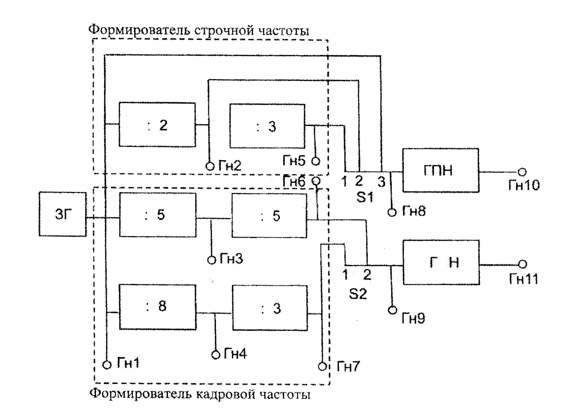 На рисунке 2 представлена более детализированная структурная схема установки. Задающий генератор вырабатывает напряжение прямоугольной формы, частота которого может регулироваться в соответствии с предложенными ниже расчетными значениями. Устройство, формирующее импульсы строчной частоты, состоит из делителей на 2 и на 3. Путем переключения S1 на генератор горизонтального отклонения могут подаваться импульсы как с частотой задающего генератора, так и с частотой в 2 или в 3 раза.
