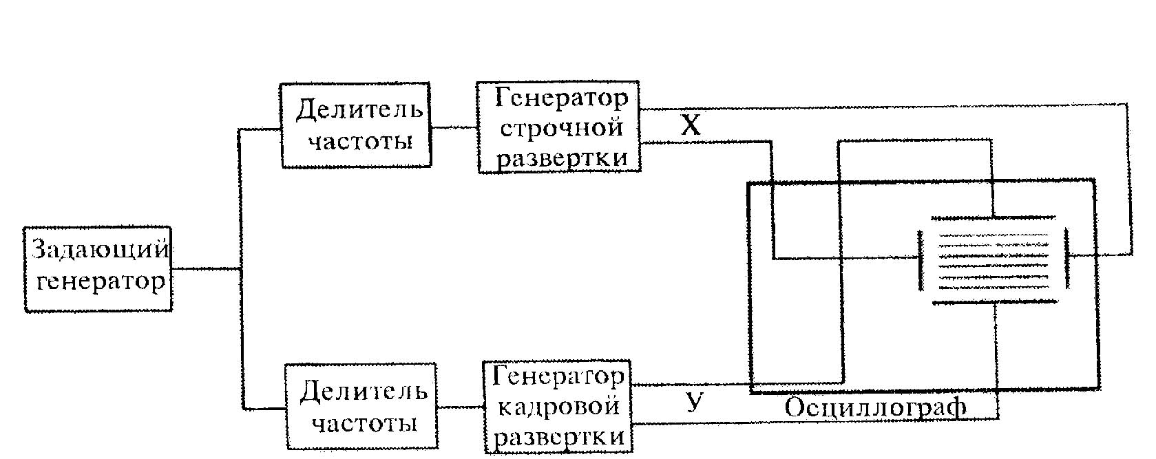 Укрупненная схема такого устройства представлена на рисунке 1. Она состоит из задающего генератора, делителей частоты, формирующих импульсы частот вертикального и горизонтального отклонений, генераторов строчной и кадровой разверток и осциллографа, на экране которого наблюдается растр.