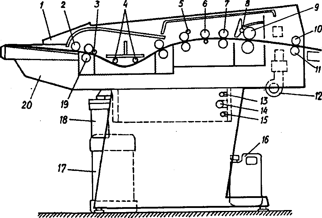 Рис. 7. Принципиальная схема процессора типа «Autolith PN»: 1 - панель управления, 2...4 - направляющие валики, 3 - прижимающий валик; 6 - стирающий валик; 7, 9, 19 - ведущие валики, 8 - всасывающий валик; .10, 11 - валики для вывода формы, 12 - вентилятор; 13...15 - насосы, 16,17 - баки;18 - фильтр; 20 - микропроцессор