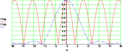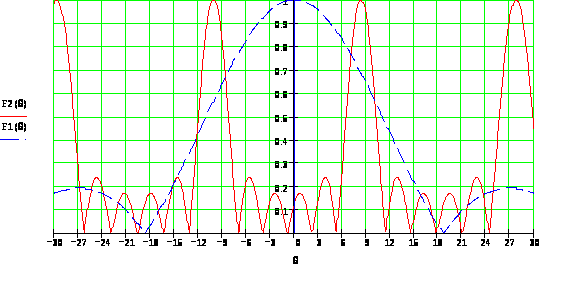 Диаграмма направленности множителя решётки и одиночного рупора в Е плоскости: