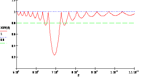 В пределах полосы пропусквния осуществляется необходимый коэффициент бегущей волны который по ТЗ должен быть больше 0.8.