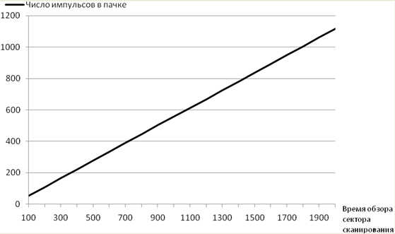 При увеличении времени обзора сектора сканирования, количество импульсов в пачке увеличивается линейно.