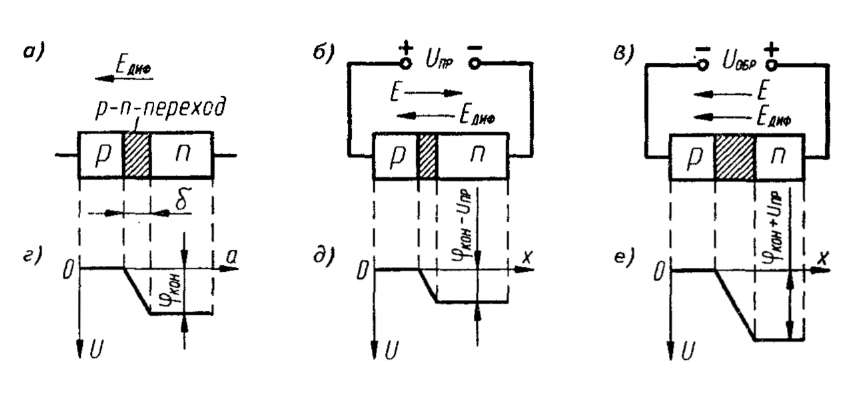 Рис. 1.2 Электронно-дырочный переход (а, б, в) и распределение поля в электронно-дырочном переходе (г, д, е)
