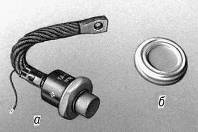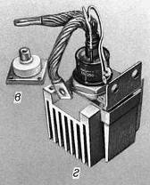 Полупроводниковый элемент Т. изготовляют из кремниевых монокристаллических дисков (пластин), вводя в Si добавки В, Al и Р. При этом в основном используют диффузионную и сплавную технологию. Конструктивно Т. выполняют (рис.4) в герметичном корпусе; для обеспечения механической прочности и устранения тепловых напряжений, возникающих из-за различия коэффициентов расширения Si и Cu (материал электродов), между кристаллом и электродами устанавливают термокомпенсирующие вольфрамовые или молибденовые диски. Различают Т. штыревой конструкции - в металлических и металлокерамических корпусах, прижимные (с отводом тепла с одной стороны Т.) и таблеточные (с двухсторонним отводом тепла). Основные конструкции Т. - таблеточная и штыревая. Т. на токи до 500 а изготовляют с воздушным охлаждением, на токи свыше 500 а - обычно с водяным.