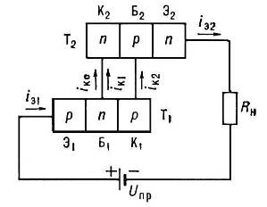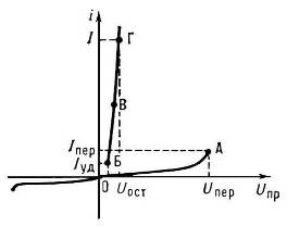 К СЭ подсоединяют токоподводы силовой цепи и устройства теплоотвода. В случае, когда к СЭ прикладывается напряжение прямой полярности U>np (>как указано на рис.1), первый (П>1>) и третий (П>3>) электронно-дырочные переходы смещаются в прямом направлении, а второй (П>2>) - в обратном. Через переходы П>1> и П>3> в области, примыкающие к переходу П>2>, инжектируются неосновные носители, которые уменьшают сопротивление перехода П>2>, увеличивают ток через него и уменьшают падение напряжения на нём. При повышении прямого напряжения ток через Т. сначала растет медленно, что соответствует участку ОА на ВАХ (рис.2). В этом режиме Т. можно считать запертым, так как сопротивление перехода П>2> всё ещё очень велико (при этом напряжения на переходах П>1> и П>3> малы, и почти всё приложенное напряжение падает на переходе П>2>). По мере увеличения напряжения на Т. снижается доля напряжения, падающего на П>2>, и быстрее возрастают напряжения на П>1> и П>2>, что вызывает дальнейшее увеличение тока через Т. и усиление инжекции неосновных носителей в область П>3>. При некотором значении напряжения (порядка десятков или сотен в), называется напряжением переключения U>пер> (точка А на ВАХ), процесс приобретает лавинообразный характер, Т. переходит в состояние с высокой проводимостью (включается), и в нём устанавливается ток, определяемый напряжением источника и сопротивлением внешней цепи (точка В на ВАХ).