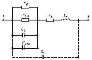 Наиболее многочисленны П. д., действие которых основано на использовании свойств электронно-дырочного перехода (р-n-перехода). Если к р-n-переходу диода (рис.1) приложить напряжение в прямом направлении (т. н. прямое смещение), т.е. подать на его р-область положительный потенциал, то потенциальный барьер, соответствующий переходу, понижается и начинается интенсивная инжекция дырок из р-области в n-область и электронов из n-области в р-область - течёт большой прямой ток (рис.2). Если приложить напряжение в обратном направлении (обратное смещение), то потенциальный барьер повышается и через р-n-переход протекает лишь очень малый ток неосновных носителей заряда (обратный ток). На рис.3 приведена эквивалентная схема такого П. д.