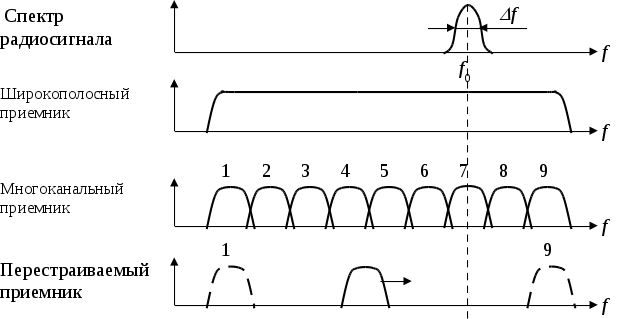 Если взять полосу пропускания приемника равной диапазону частот, в котором производится разведка (на рисунке – Широкополосный приемник), то сигнал в принципе обнаружить можно (если не учитывать что сигнал может потеряться в шумах приемника, так их мощность тем больше, чем шире полоса пропускания приемника), но измерить его параметры, например, центральную частоту, нельзя.