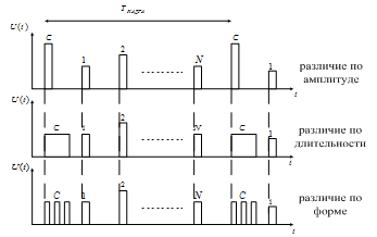 Стартовая, информационные и стоповя посылки отличаются по амплитуде, длительности или форме.