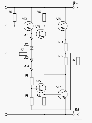 Потрібна напруга зміщення створюється на діоді, включеному в прямому напрямі. Практично рекомендується приймати число діодів кінцевого каскаду рівним числу транзисторів. У цьому випадку повинна дотримуватися умова: