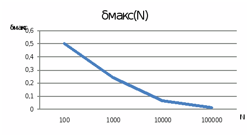 Произведем вычисление максимальной относительной ошибки вычисления вероятности для различного количества отсчетов N: