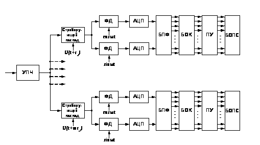 Стробирование по дальности выполняется в стробирующих каскадах, подключенных к выходу УПЧ, на которые подаются временные стробы длительностью τ>и>. Количество стробирующих каскадов равно m.
