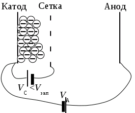 Между катодом и анодом включается источник питания (100 – 200 В), создающий сильное электрическое поле, заставляющее электроны двигаться к аноду. Источник напряжения, включенный между сеткой и катодом (единицы вольт), минусом подключен к сетке и создает тормозящее для электронов поле. Так как сетка расположена вблизи катода, то поле, создаваемое ей, может полностью скомпенсировать ускоряющее для электронов поле, создаваемое анодом. При напряжении на сетке, меньшем напряжения запирания, электроны не могут приблизиться к сетке, анодный ток I>А> равен нулю, лампа заперта. При увеличении напряжения на сетке преобладающим становится электрическое поле, создаваемое анодом. Электроны будут проходить через сетку и устремляться к аноду. Количество пропускаемых сеткой электронов увеличивается с увеличением потенциала сетки. На саму сетку электроны попасть не могут, так как она отрицательно заряжена и ток в сеточной цепи равен нулю.