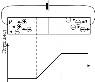 Если “минус” источника соединен с полупроводником п-типа, а “плюс” – с полупроводником р-типа, то это приведет к появлению новых электронов и дырок и движению их к р-п переходу. Электроны и дырки проникают в обедненный слой и уменьшают его толщину. Если напряжение источника превышает потенциальный барьер, то обедненный слой перестает существовать, и основные носители свободно переходят границу соединения материалов. В этом случае говорят, что р-п переход смещен в прямом направлении.