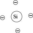 Основой транзистора является полупроводниковый материал. Полупроводниками являются химические Элементы углерод, германий и кремний. Вначале в транзисторах использовался Германий, сейчас, в основном, кремний. Атомы и германия и кремния на внешней электронной оболочке содержат по четыре электрона, как показано ниже на рисунке. А должна быть заполнена эта оболочка восемью электронами. Поэтому атомы образуют кристаллическую решетку, в которой каждый атом “отдает в совместное пользование” свои четыре электрона соседним четырем атомам. И таким образом, каждый атом имеет на внешней оболочке по восьми электронам, движущимся по немыслимым орбитам.