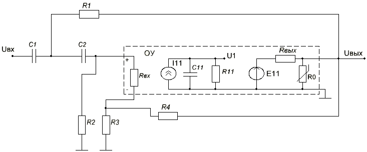 Модели пассивных компонентов остаются без изменений для данного диапазона частот. Модель операционного усилителя выделена пунктиром (рис. 1.1).