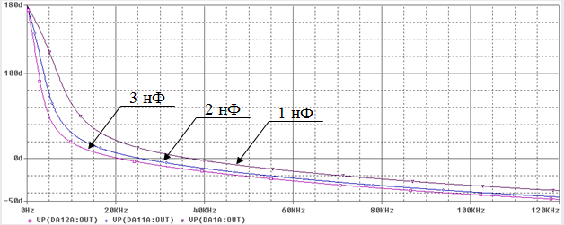 Фаза, как видим, с ростом ёмкости падает быстрее. Это связано с уменьшение сопротивления ёмкости при увеличении её номинала.