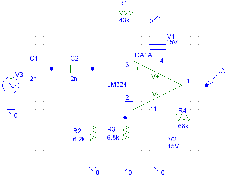 Как было выяснено, данная схема не является фильтром высоких частот, так как неправильно включён ОУ. Поэтому поменяем входы ОУ на противоположные для правильного функционирования схемы.