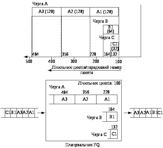 З метою ілюстрації способу моделювання схеми GPS за допомогою алгоритму FQ розглянемо три потоки трафіка – А, В і С, розміри пакетів яких складають 128, 64 і 32 байт, відповідно. Пакети надходять один за іншим на завантажений FQ-сервер у порядку Al, A2, A3, Bl, C1. Першим на FQ-сервер надходить пакет А1, потім –пакет А2 і т.д.