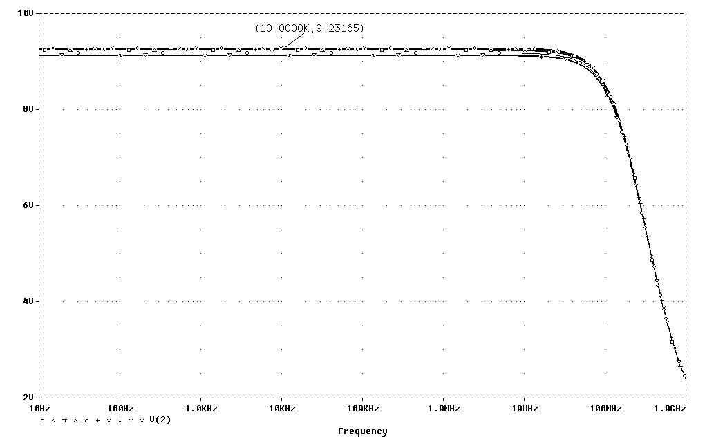 Обратите внимание на то, что характеристики построены в логарифмическом масштабе. В этом случае выражение DB(V(out)) означает, что на экран выведен график АЧХ усилителя (кривая, отмеченная знаком), охваченного ООС А>З> = 20lg[V(out)/V(in+)], поскольку напряжение V(in+) = 1 В. На этой же оси построен график ЛАЧХ усилителя без обратной связи (кривая, отмеченная знаком ◊), который представляет собой следующее математическое выражение: