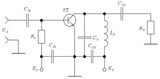 При використанні ГЗЗ із ЕП у ключовому режимі в передавачах необхідно, щоб коливання в навантаженні були гармонійними, а навантаження ЕП було б резестивним, тобто однакової для всіх гармонік колекторного струму. Таке навантаження можна здійснити за схемою, приведеної на рис. 3, де Rб = Rн.